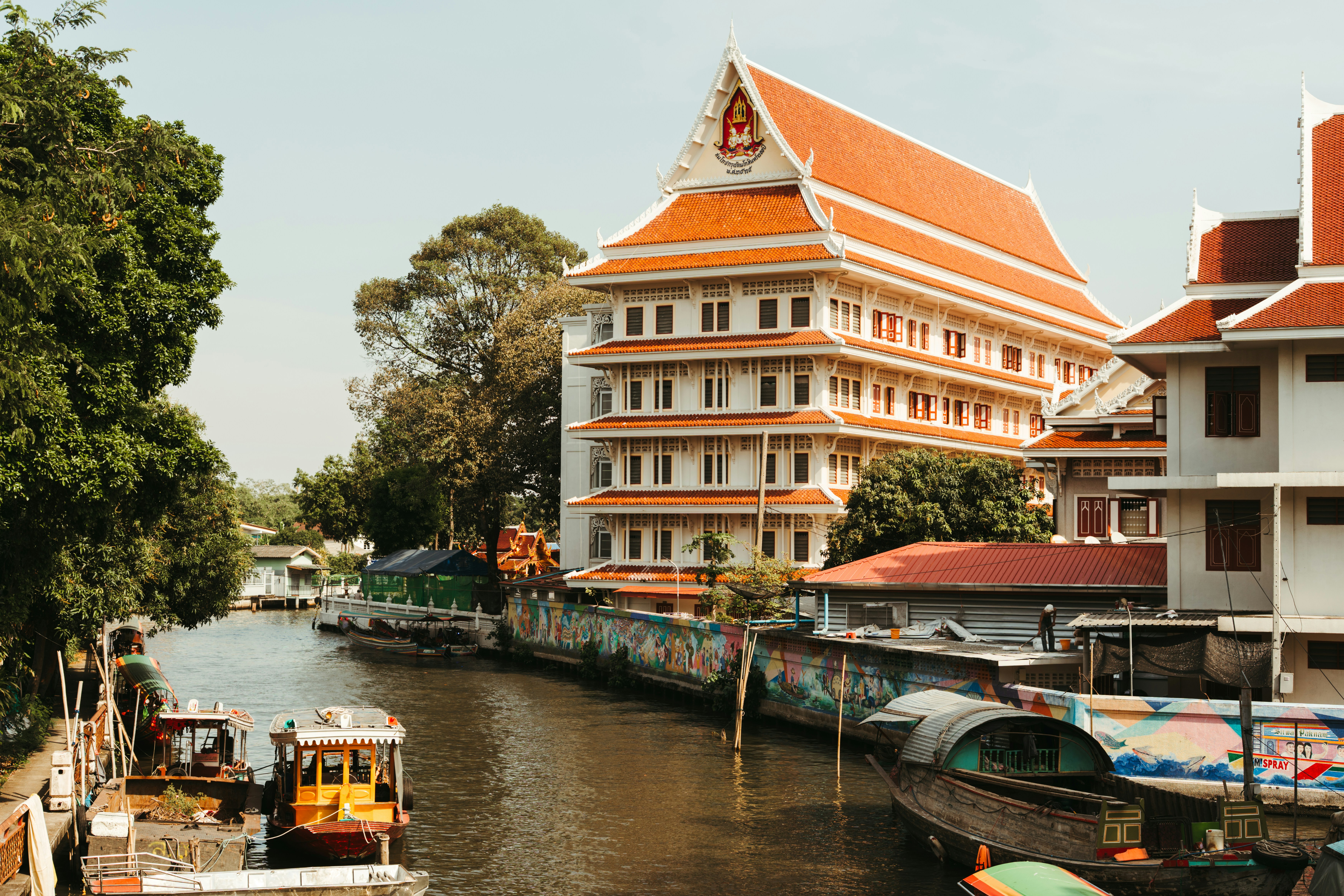 A Thai temple complex along a Bangkok canal, photographed from the waterside and from above.